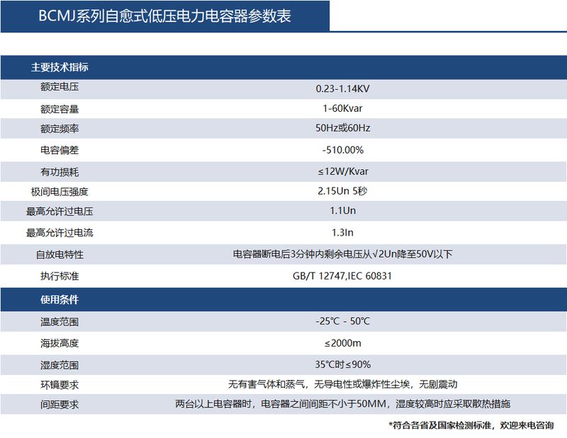 BCMJ系列自愈式低电压并联电容器适用于交流50Hz(60Hz),额定电压1000V及以下电流电力系统中,作提高功率因数、降低无功损耗、改善电压质量之用。